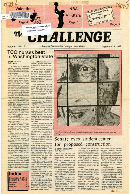The Challenge - February 13, 1987Student newspaper of the Tacoma Community College. This issue is numbered volume 23, number 6 and is eight pages. This issue contains stories on nursing program graduates ranking the best in state on their licensing exam; progress toward the proposed student center; Valentine's Day; progress on construction of the Tacoma Learning Center for children with disabilities; having a positive mindset; the TCC golf team; the men's basketball team win against Lower Columbia, loss to Clark; the beginning of the spring sports season; the Kingdome hosting the NBA All-Star professional basketball game; the upcoming production by the TCC Chamber Orchestra of the Marriage of Figaro; the upcoming drama department production of True West; the work-study program. Also includes a photo of student art on display in the art building; 'Whitt's End' humorous advice column; announcements of upcoming ski trips, open applications for the Cheryl Davis Memorial Scholarship from the Behavioral Science department, the TCC International Film Festival, a visit by a St. Martins College representative; editorials on proposed changes to the state's educational system by Governor Booth Gardner, parenting concerns; political comics; Washington state legislative updates from the student president; 'Counselor's Corner' column on love; music reviews of the Bob Seger concert at the Seattle Center Coliseum, Duran Duran album Notorious; film review of The Mosquito Coast; ads. 'On Campus and Off' section announcing jazz events the Fourth Annual Rain or Shine Jazz Festival, Centrum's Hot Jazz Port Townsend Festival; music events including a Waylon Jennings concert at the Tacoma Dome, music at the Antique Sandwich Company, the Seattle Symphony, a TCC Lip Sync competition, the TCC Chamber Orchestra production of The Marriage of Figaro, a Preservation Hall Jazz Band concert at the Pantages Centre, tenor Bruno Sebastian singing at the Seattle Opera House; miscellaneous events including a TCC Parapsychology Club meeting, the World Wrestling Federation at the Tacoma Dome, mime Marcel Marceau at the Pantages Centre, open applications for TCC activities funds requests, a Washington artists exhibit at the Tacoma Art Museum, TCC spring advising information, Transfer Information Day, a Valentine's Day display at the Wright Park Seymour Botanical Conservatory, the Seattle Aquarium 'Images of the Sea' photography contest, the Tacoma Point Defiance Zoo and Aquarium adopt an animal program; theater events including the TCC production of True West, auditions for the Tacoma Little Theater production of A Day in the Life of Joe Egg, the World Mother Goose Theater for the Very Young production of Blue Ribbon Barnyard Revue, the Tacoma Actors Guild production of The Star-Spangled Girl; workshops on the Helping Ourselves Means Education (HOME) program for low income people, teen parenting; tours of the Governor's mansion, TCC Advising sponsored tours of Western Washington University and the University of Washington. Staff credits: published by the Associated Students of Tacoma Community College; news editor Troy Wohlfeil; arts editor Debbie Snell; features editor Jane Knapper; sports editor Bill Turner; photo editor Brad Hart; on/off campus Gerie Ventura; ad manager Jim Pickett; business manager Karen Pickett; reporters and photographers Kevin Crossland, Tim Gillis, Linda Holt, Ted Mills, Lee Jae Plastino, Tad Springer, Sara Weller; typesetter Stephanie Beall; advisor R. Gilbert.