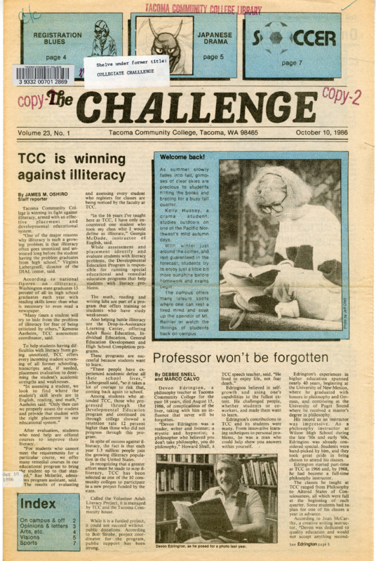 The Challenge - October 10, 1986Student newspaper of the Tacoma Community College. This issue is numbered volume 23, number 1 and is eight pages. This issue contains stories on the Developmental Education Program; the staff who support registration, with photos; actress Jane Riese and her upcoming role in TCC production Agnes of God; student opinions on options for lunch; the Japanese folk production Bekkanko Oni by visiting Tamagawa University Dance and Drama Group; the TCC cafeteria; the men's soccer team and coach Tom Keegan; the upcoming basketball season; the women's volleyball team. Also includes photo of student reading outside with a welcome back message on enjoying the last of summer sun; obituary of philosophy instructor Devon Edrington; film review of Manhunter; 'Counselors Corner' column on attending college; editorials on the proposed student activities center, US President Ronald Reagan; welcome messages from TCC President Carl Opgaard and student president Chris Farler; music review of Belinda Carlisle solo album 'Belinda'; call for Challenge staff; ads. 'On and off campus' section contains area events and news including a TCC Chamber Orchestra concert, new clubs sign-ups, an Impressionist exhibit at the Tacoma Art Museum, interpretive tours at Fort Nisqually, the Intiman Theatre production of Vikings, the Broadcast Music Inc. (BMI) Student Composers Competition, free Port of Tacoma tours, student government openings and application deadline, the Tacoma Actors Guild production of The Hasty Heart, the Playboy magazine annual College Fiction Contest, a Guitarjam guitar ensemble concert at the Pantages Centre, fall events at the Wright Park Seymour Conservatory, the new KCTS season of Nature, the Pacific Lutheran University production of The Andersonville Trial, James Burke lecturing technology at the University of Puget Sound, the Evergreen Expressions experimental theatre season on the theme of dance, TCC October credit courses, a Student Programs sponsored coed soccer tournament, a Seattle Aquarium led Cedar River salmon expedition, an exhibit on the Chinese Bronze Age in the TCC library, Counseling Center job workshops, the Richard Bangs Collier Pleneurethics Society logo design contest, graduation application deadlines, availability of free student ID cards. Staff credits: published by the Associated Students of Tacoma Community College; editor Joe Contris; news editor Marco Calvo; arts editor Laurie McKay Nelson; photo editor Hank Church; sports editor Kevin Crossland; business manager Alisa Wilder; advisor R. Gilbert; reporters and photographers Brad Arleth, Kannha Bounchanh, Dusty Fink, Lynn Hammer, Jane Knapper, Jeff Ofelt, James M. Oshiro, Rich Rasmussen, Marvin Reese, Debbie Snell, Diane Snell, Maria Valenzuela, Troy Wohlfeil; typesetter Laurie McKay Nelson.