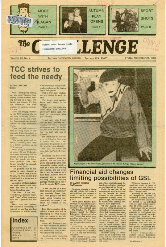 The Challenge - November 21, 1986Student newspaper of the Tacoma Community College. This issue is numbered volume 23, number 4 and is twelve pages. Content note: This issue contains an article on sexual assault on page 3. This issue contains stories on students needing food support; recent federal law affecting students' ability to qualify for financial aid; pilot Humanities courses being given high evaluations by funder the National Endowment for the Humanities (NEH); the student government and current projects; sexual assault on college campuses; attempts at racial integration in fraternities and sororities; upcoming student government projects including reactivation of the Phi Theta Kappa (PTK) local chapter; campus shoplifting; the quarterly lip-sync show in the cafeteria; technology in the library; the STAGE Program (Student Access to Growth and Earning) for training students in leadership roles; the upcoming TCC drama production of Agnes of God; the downward trend of health care programs enrollment; the possible reactivation of the PTK local chapter Chi Gamma; the men's and women's basketball teams and the beginning of the season; the Seattle Seahawks football team and their quarterbacks. Also includes photo of mime Andrew Glenn performing in the cafeteria; Counselor's Corner column on depression and the holidays; editorials on President Ronald Reagan and Iran, professional athletes' salaries; illustrations and political comics; letter to the editor praising the Challenge; book review of Stephen King novel It; humorous advice section 'Whitt's End'; film review of Tai-Pan; ads. 'On campus and off' section contains area news and events including a TCC Chamber Orchestra concert, the drama production of Agnes of God, comics Tom Ammiano and Linda Moakes at Seattle Central College, a Puget Sound Music Society Concert Band performance, the men's soccer championship game, a TCC art student exhibit, writing lab services, a Seattle Symphony concert, a public TV broadcast of a concert by Wil Ackerman, Michael Hedges and Shadowfax, open auditions for True West, a performance of 'People' by choreographer Ann Carlson at Seattle Central, an arts and crafts fair in the library, a performance of Royal Gambit at Pacific Lutheran University, a TCC Choral Concert, A Contemporary Theater (ACT) production of A Christmas Carol. Staff credits: published by the Associated Students of Tacoma Community College; editor Joe Contris; arts editor Laurie McKay Nelson; photo editor Hank Church; business manager Alisa Wilder; ad manager Brad Arleth; advisor R. Gilbert; reporters and photographers Brad Arleth, Kannha Bounchanh, Kevin Crossland, Jane Knapper, Jeff Ofelt, James M. Oshiro, Gordon Peterson, Rich Rasmussen, Marvin Reese, Debbie Snell, Bill Tucker, Troy Wohlfeil; typesetter Laurie McKay Nelson.