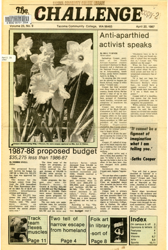 The Challenge - April 20, 1987Student newspaper of the Tacoma Community College. This issue is numbered volume 23, number 9 and is twelve pages. This issue contains stories on Institute for Black Research President Sathasivan Cooper speaking on South African apartheid; the proposed 1987-1988 student and activities budget being significantly lower; math instructor Suzanne Butschun; Vietnamese students Minh Dang and Minh Luong; an Arbor Day event at the TACID (Tacoma Area Coalition for Individuals with Disabilities) Center; parents who are also students; progress on the new student center; new Minority Achievement Program Scholarships at Western Washington University; a photographic folk art exhibit on the personification of Liberty in the TCC library; a new drama class by instructor Gwen Overland; spring movie releases; the upcoming Art Guild art display and sale; the golf team and performance at the TCC Invitational Golf Tournament; the women's tennis team and recent matches; the women's softball team's recent wins and prospects for the championship; the track team. Also includes photo of flowers on campus; opinion piece on student advising; letters to the editor responding to a previous letter and promoting the TCC Parapsychology Club, discussing student to teacher ratios in Washington state classrooms; Challenge letters policy; student government column on places to find information about campus activities; announcements of a campus blood drive, student government open positions, a clothing drive; corrections regarding potentially misleading article titles in the previous issue; 'Whitt's End' humorous advice column; campus photos and creative writing; crossword puzzle; film review of Lethal Weapon; illustrations; sports editorial on the Seattle Mariners professional baseball team; ads and classified ads. 'On Campus and Off' section includes TCC events and news including a ping pong tournament, a film screening of About Last Night, a Chamber Orchestra concert, a Swing Choir concert, a hiking trip to Gobbler's Knob at Mount Rainier, a Counseling Center workshop, work-study job openings, call for TCC team participants for the March of Dimes, a traditional Italian cooking course, an Institute for Business and Industry seminar on humor in the workplace, music instructor Gwen Overland starring in the Tacoma Little Theater production of A Day in the Death of Joe Egg, opportunity to submit comedy writing to comedian Jimmie Walker; Tacoma events and news including 'The Camera, The Zoo and You' Point Defiance Zoo and Aquarium photography event, the Ebony Fashion Fair at the Tacoma Done Convention Center, a quilting exhibit at the Tacoma Art Museum, a University of Puget Sound Women's League Flea Market, flower displays at the Seymour Botanical Conservatory; Seattle events and news including bone marrow transplant support volunteer orientation at the Fred Hutchinson Cancer Research Center, a Juilliard String Quarter concert at the University of Washington (UW), a production of play Little Eyolf at UW, the USA/USSR Goodwill Tour at UW, chorus auditions for the Seattle Opera. Staff credits: published by the Associated Students of Tacoma Community College; editor Debbie Snell; news editor Bill Turner; arts editor Jane Knapper; features editor Ted Mills; sports editor Troy Wohlfeil; photo editor Wesley Farrison; on/off campus Gerie Ventura; ad manager Marti Lambert; business manager Marti Lambert; reporters and photographers Larkin Campbell, Barbara Cohen, Richard Dupraw, Carl Goodwin, Dorothy Gordon, Tom Johanson, Marjorie McCraney, Gordon Peterson, Betty Singleton; typesetter Gerie Ventura; artist Marjorie McCraney; advisor R. Gilbert.