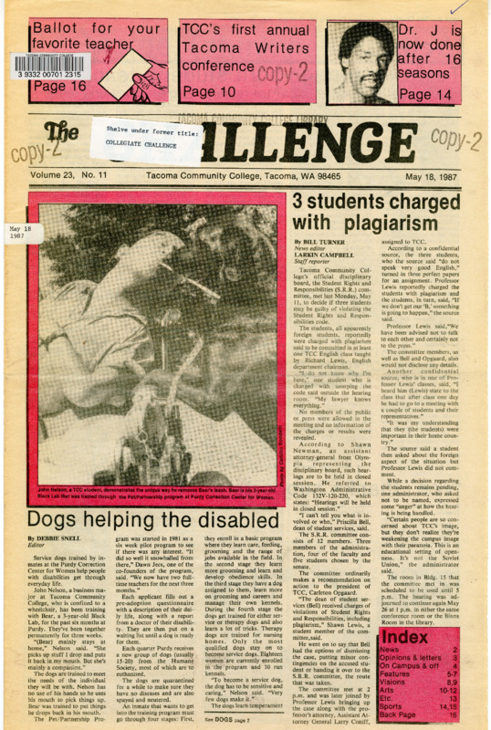 The Challenge - May 18, 1987Student newspaper of the Tacoma Community College. This issue is numbered volume 23, number 11 and is sixteen pages. This issue contains stories on a disciplinary hearing for students regarding alleged plagiarism; the service dog training program at Purdy Correction Center for Women; Illinois requiring foreign-born college instructors to pass an English test; a recent report of recommendations for the State Board for Community College Education; support and sympathy for food services manager 'Vee' Villahermosa after his family was in a serious accident; commuter students; recent changes to Washington state speed limits; Cambodian refugee student Tea Gov and his assault off-campus; the seven year anniversary of the Mount St Helens eruption; Assistant Dean of Continuing Education Tanya Brunke receiving an award from the Northwest Adult Education Association; the upcoming Tacoma Writers Conference, with keynote speakers Kenneth Gouldthorpe and Murray Morgan; fashion seminar 'Investment Dressing' by Nordstrom Personal Touch department; the Ebony Fashion Fair in Tacoma; the recent discovery of US Department of Education workers backdating documents; Gordon R. Peterson receiving a Pleneurethic Scholarship; lack of fan support for the track team; golf team member Steve George; recent arrests on college campuses of college athletes causing disturbances; recent issues of faculty pay on college campuses. Also includes opinion pieces on the student disciplinary hearing, plagiarism; letters to the editor seeking advisors for the Parapsychology Club, thanking TCC for the recent blood drive's success; student government column on a new grading policy; poetry; a map of Point Defiance Park; film reviews of Garden of Stone, Extreme Prejudice, Evil Dead II; crossword puzzle; local concerts calendar; 'Whitt's End' humorous advice column; counseling column on wellness; sports editorials on the retirement of professional basketball player Julius Winfield Erving, being a sports nut; a photo of Point Defiance Park; announcement and entry form for a Chi Gamma sponsored Teacher of the Year Award; ads and classified ads. 'On Campus and Off' section contains TCC news and events including summer, fall, and evening student advising information, a visit by a Pacific Lutheran University representative, a dim sum cooking class, a high school student art show in the library, the Annual TCC Spring Celebration; regional news and events including opening dates for locations within Mt. Rainier National Park, the first annual Horse-O-Thon at Oakwood Arena, Seattle's Pike Place Market Festival '87, the Masters of the Universe Power Tour live at the Tacoma Dome, the Antique Sandwich Company Spring Folk Festival concerts, an album release party for Tim Noah at the Tacoma YWCA, Rape Awareness Week information, the Black Community Festival in Tacoma, the Chinook Center for the Performing Arts production of A Midsummer Night's Dream; TV programs on AIDS, money, and Alzheimer's disease. Staff credits: published by the Associated Students of Tacoma Community College; editor Debbie Snell; news editor Bill Turner; arts editor Jane Knapper; features editor Ted Mills; sports editor Troy Wohlfeil; photo editor Wesley Farrison; on/off campus Gerie Ventura; ad manager Marti Lambert; business manager Marti Lambert; reporters and photographers Larkin Campbell, Barbara Cohen, Carl Goodwin, Dorothy Gordon, Tom Johanson, Marjorie McCraney, Gordon Peterson, Betty Singleton; columnists Chris Farler, Phil Griffin, Whitney Keyes, Sandy Plann, William W. Whitt; typesetter Gerie Ventura; artist Marjorie McCraney; advisor R. Gilbert.