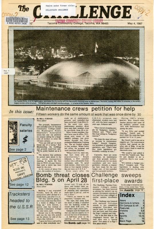 The Challenge - May 4, 1987Student newspaper of the Tacoma Community College. This issue is numbered volume 23, number 10 and is sixteen pages. Content note: This issue contains an article discussing child abuse on pages 3 and 15. This issue contains stories on the maintenance crew petitioning for more staffing; a bomb threat to Building 5; the Challenge winning multiple college campus newspaper awards; national average faculty salaries and the gender gap in pay; a congressional report on student loans; open student government positions and their roles; Black men's experiences in America; counselor and instructor Dick Patterson; English and Humanities instructor Marlene Bosanko; night student programs; the upcoming Transfer Information Day; the average TCC student; student frustration with campus parking; Japanese nursing student Hiroko Osashi; the TCC Child Care Center; the Puget Sound Music Society Concert Band; a TCC art exhibit and sale; current and upcoming exhibits at the Tacoma Art Museum; the release of Beatles albums on CDs; student athletes traveling to the Soviet Union; Tacoma Tigers baseball at Cheney Stadium; the men's baseball team and recent games, with numerous photos; recent student newspaper editor firings across the country. Also includes photos of the Tacoma Dome, Old City Hall, the Narrows Bridge, waterfront; opinion piece on campus parking; Challenge ad rates, letters policy; Student Programs announcement of Spud Week; student government column on student organizations; counseling column on child abuse; crossword puzzle; information and images for TCC International Film Festival screenings; music review of the Europe concert at the Paramount Theatre, U2 album The Joshua Tree; call for sponsors of student athletes traveling to the Soviet Union; 'Whitt's End' humorous advice column; ads and classified ads; University of Washington (UW) scholarship information. 'On Campus and Off' section contains Tacoma events and news including a call for English teaching volunteers for the Tacoma Area Literacy Council, Antique Sandwich Company Spring Folk Festival concerts, a Tacoma Youth Symphony concert, a Pantages Centre benefit with Gloria Vanderbilt, call for creative writing submissions to the Tacoma Writer's Club magazine Spindrift, a concert of Benjamin Britten's War Requiem at Pacific Lutheran University, call for radio scripts for KUPS Radio Theater, Romance Writers of America meetings at the Tacoma Public Library; TCC events and news including a cooking seminar, a fashion show by Nordstrom and Student Programs, a free parenting workshop, a free job interview workshop, a film screening of 'White Water Rafting'; Seattle events and news including a Billy Idol concert at the Seattle Center Coliseum, the 5th Avenue Theater production of Arsenic and Old Lace, the UW production of Ironheart, a Jack Wagner concert at the Paramount Theatre, a Run DMC and Beastie Boys concert at the Seattle Center Coliseum; family entertainment at Enchanted Village Family Park, Northwest Trek Wildlife Park, the Historical Society Museum, Never Never Land, Snake Lake Nature Center, Seattle Children's Theater, the Evergreen State College Cinco de Mayo Festival, and the Seattle Aquarium. Staff credits: published by the Associated Students of Tacoma Community College; editor Debbie Snell; news editor Bill Turner; arts editor Jane Knapper; features editor Ted Mills; sports editor Troy Wohlfeil; photo editor Wesley Farrison; on/off campus Gerie Ventura; ad manager Marti Lambert; business manager Marti Lambert; reporters and photographers Larkin Campbell, Barbara Cohen, Richard Dupraw, Carl Goodwin, Dorothy Gordon, Tom Johanson, Marjorie McCraney, Gordon Peterson, Betty Singleton; columnists Dick Deyoe, Chris Farler, William W. Whitt; typesetter Gerie Ventura; artist Marjorie McCraney; advisor R. Gilbert.