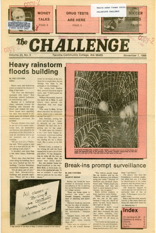 The Challenge - November 7, 1986Student newspaper of the Tacoma Community College. This issue is numbered volume 23, number 3 and is twelve pages. This issue contains stories on flooding in Building 8 due to a rainstorm; increases to security surveillance of the parking lots due to break-ins; student athlete perspectives on college athletics drug testing; the rise of drug testing; the Education Corporation of America (ECA) seeking to bring public campus functions under private management; the TCC custodial, maintenance, and grounds crews; the benefits of community colleges; the TCC sponsored Puget Sound Music Society Concert Band; expansion of TCC computer programs and resources; the 1984 Supreme Court case gutting Title IX; the women's volleyball team loss to Green River; the men's soccer team tie with Pierce College; the renovation of the gym and safety issues; English instructor and Seattle Times book reviewer Richard Wakefield. Also includes photo of a spider web; Counselors Corner column on test anxiety; music review of Paul McCartney album Press to Play; editorials on drug testing, student government review of smoking on campus; syndicated political comics; letter to the editor responding to a previous editorial on the Strategic Defense Initiative (SDI); faculty advice column; crossword puzzle; music review of the Van Halen concert in Seattle; film review of The Color of Money; call for Challenge staff; announcement for the Journalism 201 class; ads and classified ads. 'On campus and off' section contains area news and events including the fourth annual Tacoma Wine Festival, Transfer Information Day, the Tacoma Little Theater production of Sly Fox, the University of Washington Opera production of A Midsummer Night's Dream, a TCC rafting trip, a Tacoma Youth Symphony concert, TCC golf team openings, a Metropolitan Parks sponsored tour, open registration for Treasure Hunt '86, a concert by Sandra Reaves-Phillips, a conference by Chemical Abuse Resources and Education (CARE), a performance by mime Andrew Glenn, a childcare exchange board in the Educational Opportunity and Resource Center (EORC), a cat art exhibit at the Tacoma Art Museum Children's Gallery, call for donations to the Emergency Food Network holiday drive, the production of Malpractice at Pantages Center, a TCC Advising Center sponsored tour of Pacific Lutheran University, a Burke Museum screening of The Lost Voyage of Paperouse, a dance performance by Cornish College of the Arts students. Staff credits: published by the Associated Students of Tacoma Community College; editor Joe Contris; arts editor Laurie McKay Nelson; photo editor Hank Church; business manager Alisa Wilder; ad manager Brad Arleth; advisor R. Gilbert; reporters and photographers Brad Arleth, Kannha Bounchanh, Kevin Crossland, Jane Knapper, Ted Mills, Jeff Ofelt, James M. Oshiro, Gordon Peterson, Rich Rasmussen, Marvin Reese, Debbie Snell, Bill Tucker, Troy Wohlfeil; typesetter Laurie McKay Nelson.