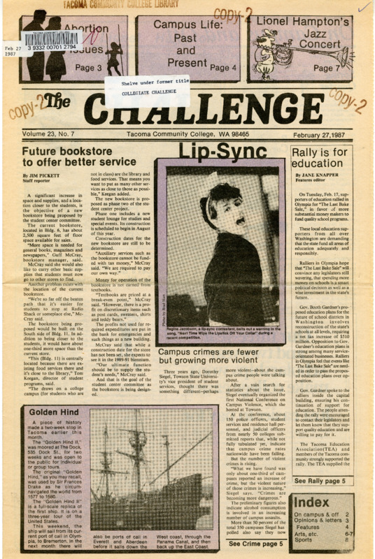 The Challenge - February 27, 1987Student newspaper of the Tacoma Community College. This issue is numbered volume 23, number 7 and is eight pages. This issue contains stories on a proposed new campus bookstore; a rally in Olympia for education funding; the decrease in crime but rise of violence on campuses nationwide; a new 'linked' course in chemistry and English; campus history, with photos; technical difficulties at the lip sync event; the upcoming concert by jazz musician Lionel Hampton and his orchestra; the men's basketball team win against Grays Harbor; the men's baseball team and upcoming season; the women's softball team and upcoming season. Also includes photos of the recent lip sync competition, the replica of Sir Frances Drake ship The Golden Hind at the Tacoma Dock; editorial on abortion; announcements of open submissions for letters and opinions in the Challenge, open staff positions for the Challenge; student government updates on new and outgoing representatives, club funding, and Student Center progress; 'Counselor's Corner' column on drinking; music review of Canadian band Glass Tiger; comics; film reviews of Platoon and Outrageous Fortune; ads. 'On Campus and Off' section announcing campus events and news including spring quarter registration, spring quarter advising, open applications for the SPRUCE tuition waiver program, open applications for Challenge editor positions, a film screening of Ferris Bueller's Day Off, intramural volleyball games, wine seminars, a cafeteria concert by Kendra and Berry; Tacoma area events including Victory Music concerts at the YWCA, a production of Johnny Appleseed at the Pantages Theatre, a Lionel Hampton concert at the Temple Theater, a Charles Wright Upper School production of play Amadeus, a TCC Institute for Business and Industry seminar on sexual harassment at the Tacoma Sheraton, a University of Puget Sound production of musical Promenade, open nominations for the YWCA outstanding women of achievement awards; Seattle events including a Ballet Folklorico Nacional de Mexico performance at the University of Washington (UW) Meany Theater, an indoor kids carnival at the Seattle Center House, open submissions for the Bumbershoot Poster Design Competition, a Wang Chung concert at the Paramount Theater, Fat Tuesday celebrations at Union Station, a UW production of The Pirates of Penzance, open bids for Bumbershoot souvenir items. Staff credits: published by the Associated Students of Tacoma Community College; news editor Troy Wohlfeil; arts editor Debbie Snell; features editor Jane Knapper; sports editor Bill Turner; photo editor Brad Hart; on/off campus Gerie Ventura; ad manager Jim Pickett; business manager Karen Pickett; reporters and photographers Kevin Crossland, Tim Gillis, Linda Holt, Ted Mills, Lee Jae Plastino, Tad Springer, Sara Weller; typesetter Stephanie Beall; advisor R. Gilbert.