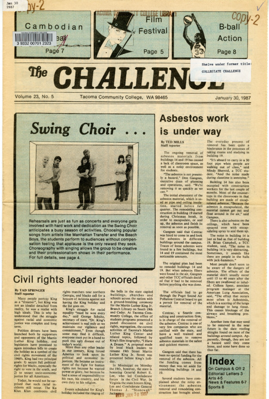 The Challenge - January 30, 1987Student newspaper of the Tacoma Community College. This issue is numbered volume 23, number 5 and is eight pages. This issue contains stories on an asbestos removal project in buildings 14 and 19; Martin Luther King Jr. day; recent student government meetings; delays to plans for an art building remodel and new art gallery; the TCC Swing Choir; the Tacoma International Film Festival; holiday movie releases; the buildings and grounds maintenance team; college publications and schedules; international transfer students; a student ski trip; the men's basketball team win at the Bellevue Christmas Tournament and other recent games. Also includes a photo of Swing Choir rehearsal; humorous advice column 'Whitt's End'; editorial on defending arts education; political comics and clip art; 'Counselor's Corner' column on setting personal goals; music review of Boston album 'Third Stage'; International Film Festival schedule; crossword puzzle; guest article by a Cambodian refugee; a syndicated story on campus protests of drug testing policies; announcements of open staff positions at the Challenge, open art scholarships the David Lassoie Memorial Art Foundation Scholarship and the Harris Tsang Architects scholarship; ads. 'On Campus and Off' section contains area events and news including a concert by Diane Schurr at the Pantages Centre, a piano concert by Liz Story at the Broadway Performance Hall, the 1987 Tacoma Film Festival, Counseling Center job workshops, a concert by T.R. Stewart and Pedar Herom at the YWCA, Seattle Aquarium classes, a performance of Gilbert and Sullivan opera Patience; upcoming men's and women's basketball games, a TCC ping pong tournament, a film screening of Running Scared, benefit event 'Celebrating Women in Sign' at Broadway Performance Hall, a seafood cooking workshop, a parenting workshop, open applications for student Vice President of Legislation, the University of Washington production of As You Like It, the University of Puget Sound productions of one-act operas The Toy Shop and the The Game of Chance, the Seattle Rep production of 'Joe Turner's Come and Gone,' a trumpet concert by Maynard Ferguson, a concert by the Irish Rovers at the Pantages Centre, a Red Cross blood drive, a film screening of Sure Thing. Staff credits: published by the Associated Students of Tacoma Community College; news editor Troy Wohlfeil; arts editor Debbie Snell; features editor Jane Knapper; sports editor Bill Turner; photo editor Brad Hart; on/off campus Gerie Ventura; ad manager Jim Pickett; business manager Karen Pickett; reporters and photographers Kevin Crossland, Tim Gillis, Linda Holt, Ted Mills, Lee Jae Plastino, Tad Springer, Sara Weller; typesetter Stephanie Beall; advisor R. Gilbert.