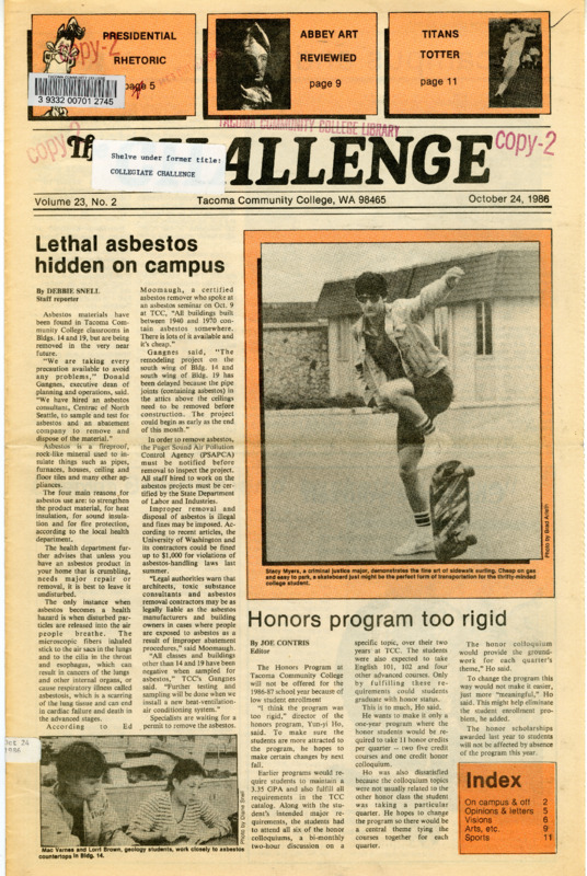 The Challenge - October 24, 1986Student newspaper of the Tacoma Community College. This issue is numbered volume 23, number 2 and is twelve pages. Content note: This issue contains mention of sexual assault on page 3. This issue contains stories on asbestos removal on campus; the Honors Program not being offered in 1986/87 and potential changes to the program; TCC instructor and Tacoma City Councilman Jack Hyde; recent college athlete scandals and trials; the devaluation of the arts in school curriculum; the history of the TCC nature center; renovation of the gym; an upcoming student senate study of smoking on campus; Saudi Arabian students describing life at home; the Tacoma Art Museum exhibit of religious art from the Martin of Tours exhibition with contemporary regional art; the TCC Veteran's Affairs department; college campuses finding the bacteria that causes Legionnaires disease in their air conditioning systems; the men's soccer team; basketball coach Ron Billings. Also includes photo of student with skateboard; 'Counselors Corner' column on self esteem; advice column by faculty member; editorials on the summit between US President Ronald Reagan and USSR President Mikhail Gorbachev in Iceland, the development of the TCC student center; syndicated political comics; letters to the editor responding to a previous editorial on Reagan, discussing the recent summit in Iceland and the Strategic Defense Initiative (SDI); crossword puzzle; film review of Peggy Sue Got Married; call for Challenge staff; ads. 'On campus and off' section contains area news and events including a TCC ski trip to Austria, TCC workshops, the Pacific Lutheran University production of The Andersonville Trial, a concert by the Oregon Symphony Orchestra, a Tacoma Art Museum exhibit of the Martin of Tours Collection, the Tacoma Actors Guild production of Who's Afraid of Virginia Woolf?, a public TV program on C.S. Lewis and Joy Gresham, a TCC trip to Northwest Trek, a Celtic music concert by Philip and Pam Boulding, a children's production of Jack and the Beanstalk, a TCC Stephen King film festival, an Emerson Lake & Powell concert in Seattle, a Tacoma Concert Band performance, a TCC intramural table tennis tournament, the ACT (A Contemporary Theater) production of Little Shop of Horrors, a James Brown concert in Seattle, a classical piano concert by Malcolm Bilson, a concert by Michael O'Domhnail and Billy Oskay, a concert by violinist Pinchas Zukerman and pianist Marc Neikrug, a TCC advising tour of the University of Puget Sound, the Seattle Repertory Theater production of Richard III, a lecture by South African refugee and activist Dumisani Kumalo, a TCC coed volleyball tournament, lip sync program tryouts. Staff credits: published by the Associated Students of Tacoma Community College; editor Joe Contris; arts editor Laurie McKay Nelson; photo editor Hank Church; sports editor Kevin Crossland; business manager Alisa Wilder; ad manager Brad Arleth; advisor R. Gilbert; reporters and photographers Brad Arleth, Kannha Bounchanh, Jane Knapper, Jeff Ofelt, James M. Oshiro, Rich Rasmussen, Marvin Reese, Debbie Snell, Bill Tucker, Troy Wohlfeil; typesetter Laurie McKay Nelson.