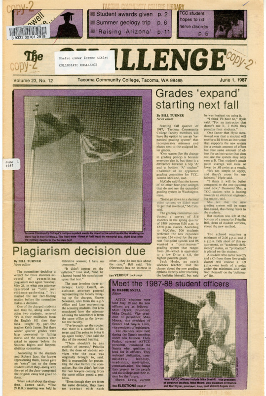 The Challenge - June 1, 1987Student newspaper of the Tacoma Community College. This issue is numbered volume 23, number 12 and is sixteen pages. This issue contains stories on a new expanded grading system; updates on the disciplinary hearing for students regarding alleged plagiarism; new student government officers; a staff vs students softball game; award recipients at the Student Awards Banquet; annual tuition waivers awarded to high school seniors; the Challenge winning a Washington Press Association award; summer jobs for students without work-study; student Eric Featherstone raising money for a treatment for his Friedrich's Ataxia neurological disorder; the retirement of faculty members Carolyn Simonson, Dick Giroux, Lorraine Stephan, and Ruth Zelenak; geology instructor Jack Hyde's summer geological excursion course; the Administration of Justice program; scholarships and financial aid; TCC campus grounds and the maintenance crew; Point Defiance Park; Cambodian refugee student Tea Gov (a continuation from the previous issue); an upcoming TCC Swing and Concert choirs concert; the women's softball team taking second in the division, with numerous photos; campus weight training facilities; spring sports in review, with highlights from softball, baseball, track, golf, and tennis; the annual athletic awards; a Seattle charity being sued for making untrue statements about their benefit event. Also includes photo of the flags on campus; opinion pieces on Memorial Day, the end of the academic year for Challenge staff; letters to the editor on retiring, criticizing sports coverage, congratulating the Challenge for their recent awards; student government column on accomplishments of the academic year; student's summer plans;photos of the Challenge staff; film review of Raising Arizona; book reviews for summer reading; poetry; music review of the Billy Idol concert at the Seattle Center Coliseum; crossword puzzle; 'Whitt's End' humorous advice column; sports editorials on professional basketball, Northwest sports; 'Counselor's Corner' column on change; ads. 'On Campus and Off' section - handwritten in this issue - contains news and events including the Puyallup Fair concerts, a lecture by sex educator Dr RUth Westheimer at the Seattle Opera House, Tacoma Actors Guild auditions, a Beastie Boys and Run DMC concert at the Seattle Center Arena, the world premiere of The Tragedy of Romeo and Juliet by Pacific Northwest Ballet, a Carson Cole and R.U.4. at the Poulsbo Community Auditorium, a benefit performance of Cats for the Fred Hutchinson Cancer Research Center, an American Heart Association benefit of a 'Heartthrob' date auction. Staff credits: published by the Associated Students of Tacoma Community College; editor Debbie Snell; news editor Bill Turner; arts editor Jane Knapper; features editor Ted Mills; sports editor Troy Wohlfeil; photo editor Wesley Farrison; on/off campus Gerie Ventura; ad manager Marti Lambert; business manager Marti Lambert; reporters and photographers Larkin Campbell, Carl Goodwin, Dorothy Gordon, Tom Johanson, Marjorie McCraney, Gordon Peterson, Betty Singleton; columnists Kathy Acker, Chris Farler, Sandy Plann, William W. Whitt; typesetter Gerie Ventura; artist Marjorie McCraney; advisor R. Gilbert.