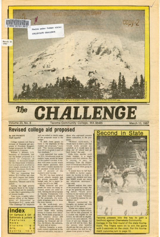 The Challenge - March 13, 1987Student newspaper of the Tacoma Community College. This issue is numbered volume 23, number 8 and is twelve pages. Content note: This issue contains discussion of abortion on page 3. This issue contains stories on proposed changes to federal financial aid programs; places to visit for spring break; March of Dimes volunteer Robert Sorensen; a new class on Afro-American literature; the possibility of a performing band for basketball games; expectations that tuition increases will outpace inflation nationwide; the new TCC Art Guild student group; the Winter Choral Concert by the concert and swing choirs; the University of Alabama preventing a student from producing a play on campus and the student's suit against them; sports funding at TCC; the men's basketball team placing second in the state tournament, with many photos. Also includes photos of Mount Rainier, the men's basketball game against Chemetka; 'Whitt's End' humorous advice column; letters to the editor responding to the previous issue's editorial on abortion and an editor's response to one; comics; calls for letters and opinions in the Challenge, submissions to the TCC Art Guild art sale, submissions to TCC literary magazine Trillium, Challenge staff; student government updates including recent purchase of a microwave for student use, campus suggestion boxes; 'Counselor's Corner' column on alcohol and the family; poetry and photography; editorial comparing campus entertainment at TCC and Pierce College; results of a student music poll; film review of Hoosiers; ads. 'On Campus and Off' section announcing campus events and news including classes and private lessons for keyboard, spring quarter registration information, the new TCC Art Guild, English instructor Georgia McDade passing her doctoral exam, a volunteer tutoring workshop for Tacoma Area Literacy Council (TALC); Tacoma events and news including a White Heart concert at Pacific Lutheran University, a Northwest VW Club car show and swap meet, a production of musical Can-Can at the Pantages Centre, the Marlboro Concert Series of country music at the Tacoma Dome, auditions for the Tacoma Little Theater production of Something's Afoot, a lecture on death and bereavement by Rabbi Earl A. Grollman, the Shrine Circus, the YWCA Woman of the Year award luncheon, 'Inner Space' event at the Point Defiance Aquarium; Seattle events and news including a Reilly and Maloney concert at the Museum of History and Industry, Dinosaur Day at the Burke Museum, comedian Howie Mandel at the Paramount Theatre, the Seattle Cherry Blossom and Japanese Cultural Festival, a Temptations concert at the Paramount Theatre, the Emerald City Marathon. Staff credits: published by the Associated Students of Tacoma Community College; news editor Troy Wohlfeil; arts editor Debbie Snell; features editor Jane Knapper; sports editor Bill Turner; photo editor Brad Hart; on/off campus Gerie Ventura; ad manager Jim Pickett; business manager Karen Pickett; reporters and photographers Kevin Crossland, Brad Hart, Linda Holt, Ted Mills, Jim Pickett, Sydney Smith, Tad Springer; typesetter Stephanie Beall; artist Brad Hart; advisor R. Gilbert.