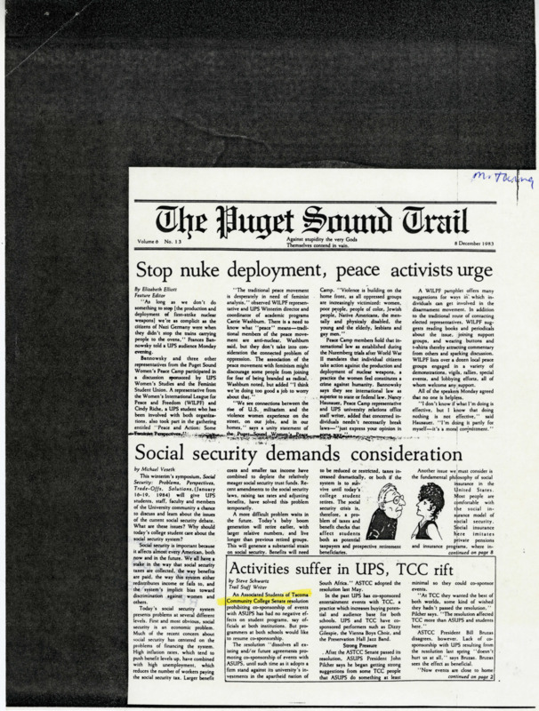 Photocopy of a newspaper clipping from the University of Puget Sound (UPS) student newspaper, The Puget Sound Trail. The highlighted article is by Steve Schwartz titled, 'Activities suffer in UPS, TCC rift.' Handwritten on the copy is 'M. Turner,' referring to Student Activities Director Mark Turner, who is quoted in the article.