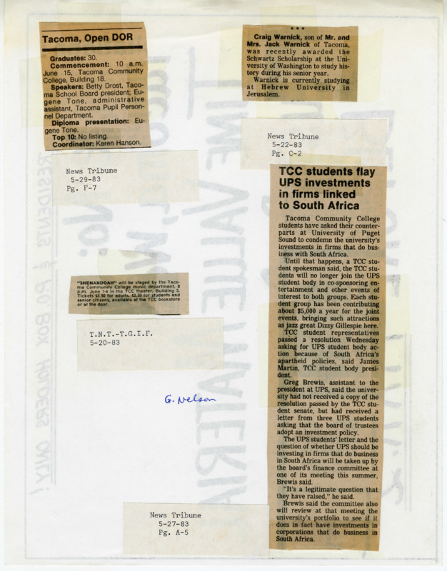Clipping 4: Article with headline, 'TCC students flay UPS investments in firms linked to South Africa.' Article describes the resolutions passed by TCC student government ending their relationship with the University of Puget Sound until their student government condemns their schools investments in apartheid South Africa. News Tribune, May 27, 1983, page A-5.