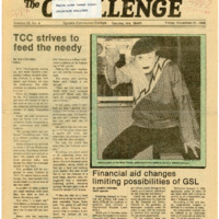 This issue contains stories on students needing food support; recent federal law affecting students' ability to qualify for financial aid; pilot Humanities courses being given high evaluations by funder the National Endowment for the Humanities (NEH); the student government and current projects; sexual assault on college campuses; attempts at racial integration in fraternities and sororities; upcoming student government projects including reactivation of the Phi Theta Kappa (PTK) local chapter; campus shoplifting; the quarterly lip-sync show in the cafeteria; technology in the library; the STAGE Program (Student Access to Growth and Earning) for training students in leadership roles; the upcoming TCC drama production of Agnes of God; the downward trend of health care programs enrollment; the possible reactivation of the PTK local chapter Chi Gamma; the men's and women's basketball teams and the beginning of the season; the Seattle Seahawks football team and their quarterbacks.
