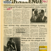 This issue contains stories on a visit by the International Student Organization (ISO) to the state capitol building and Olympia Brewery; opposition to the state's Higher Education Coordinating Board Master Plan due to its emphasis on standardized testing; the upcoming lecture by glass artist Dale Chihuly; the Tax Reform Act of 1986 and possible changes to scholarships; the state senate approval of the Higher Education Coordinating Board's Master Plan; an upcoming diabetes forum at Ballard Community Hospital in Seattle; test taking strategies; construction on campus, with photo collage; student Marlys Ducharme attending the Winter Olympics in Calgary; TCC arts student Frank White; the fencing club; the women's basketball team loss to Centralia.