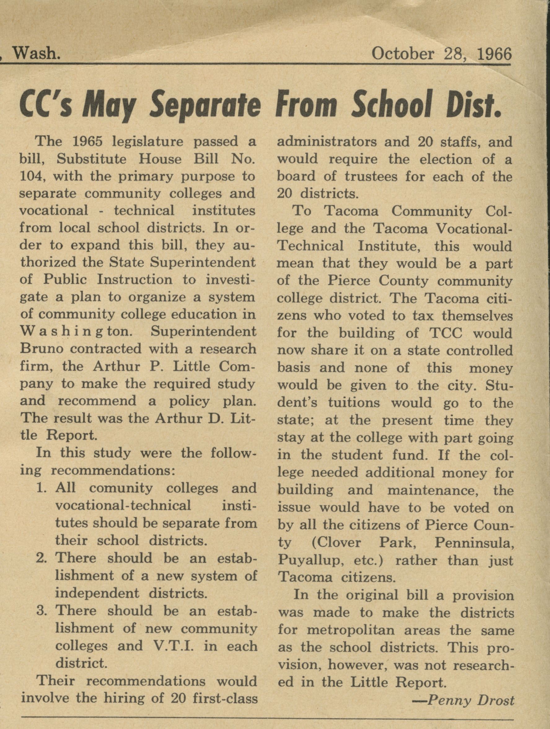 One such issue was the Arthur D. Little Report, which recommended the separation of the community colleges from the school districts and the creation of a new community college district system. The report was produced under contract with the Washington State Superintendent of Public Instruction in order to support Substitute House Bill No. 104. The bill was passed by the 1965 legislature, which set in motion the separation of Tacoma Community College from Tacoma School District No. 10 (page 2).